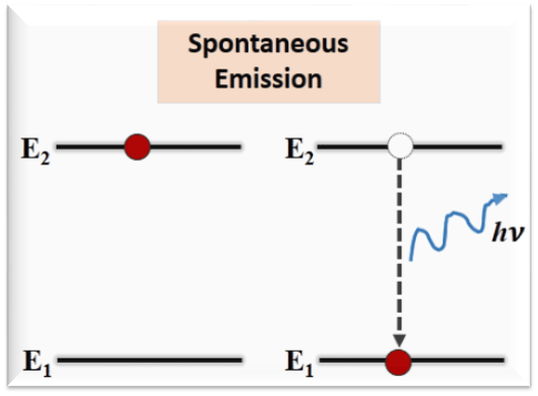 2. Spontaneous emission: The excited atom does not stay in a long time in the excited state and after 10-8 s it comes back to lower energy state by releasing a photon of energy hv = E2 – E1.