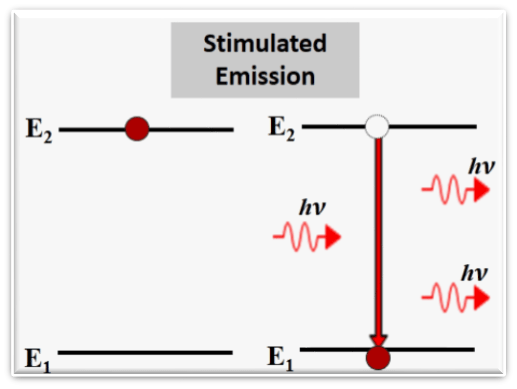 This process requires the presence of an additional radiation (photon). When an atom in the excited state interacts with an external photon of energy hv = E2 – E1 , this photon triggers or stimulates the excited atom to fall to lower energy state well before the atom can make spontaneous transition.