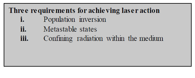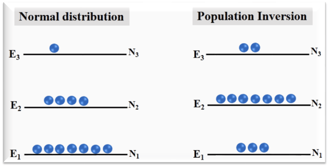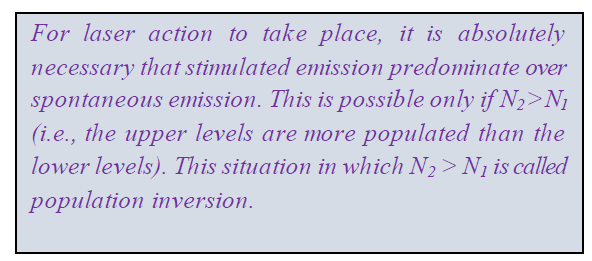 Normally, excited atoms have short lifetimes and release their energy in a matter of (10-8s) through spontaneous emission. Hence, population inversion cannot be established under such circumstances.