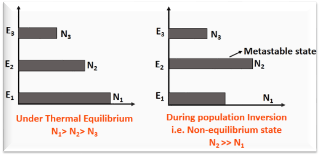 The state in which the number of atoms present in the excited state (N2) is greater than the number of atoms present in the ground state (N1) i.e. (N2 >> N1) is called population inversion.