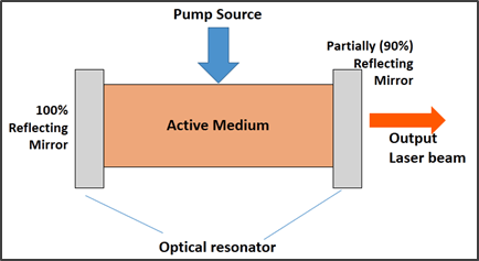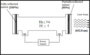 - Optical resonator: Two reflecting mirrors are fixed on both the ends of the discharge tube. One mirror is partially reflecting and the other is fully reflecting. This arrangement of mirrors act as optical cavity or Fabry-Perot resonator.
