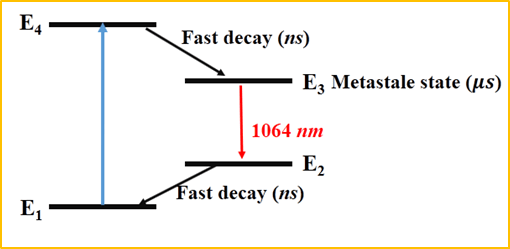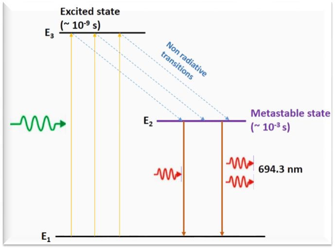 EXTRA Information: Refer to figure above, when a suitable energy is supplied to the system, atoms get excited into E3. After their lifetime the atoms are transit into E2. Due to more lifetime of an atom in state E2 (as it is a metastable state), the atoms stay here for longer time than compared to state E3. Because of the accumulation of atoms in state E2, the state of population inversion is achieved between states E1 and E2.