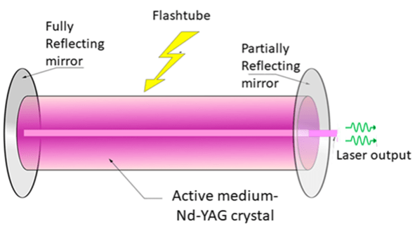 - Light from Krypton flash tube or laser diode acts as pumping source.