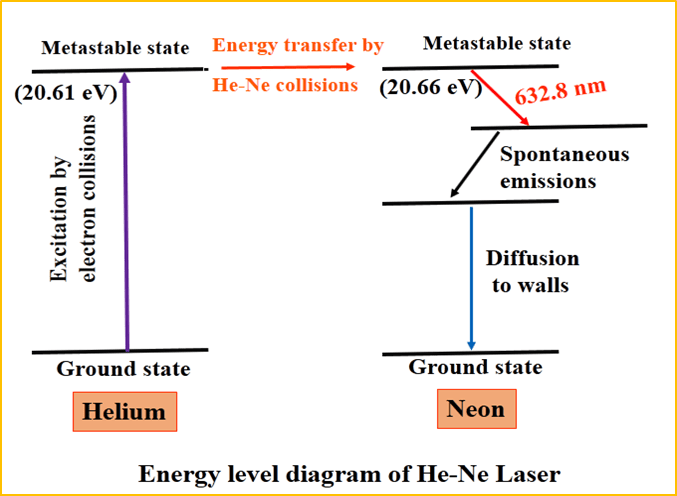 - The excited neon atoms come to the ground state through frequent collisions with the walls of the glass discharge tube and again available for excitation to higher energy levels and participation in laser action. It is important for the continuous wave (CW) operation.