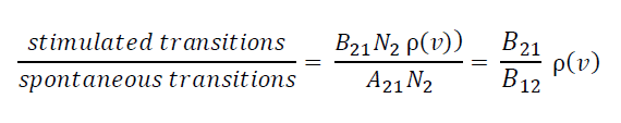 - Relation (6) shows that the ratio of coefficients of spontaneous vs. stimulated emissions is proportional to the cube of frequency of radiation. That’s why it is somehow difficult to achieve laser action in higher frequency ranges such as X-rays.